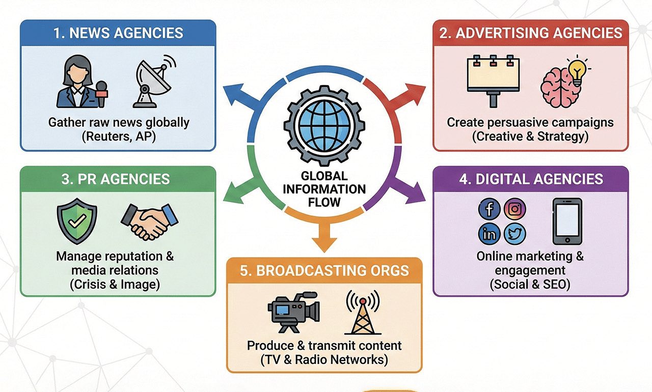 In the simplest terms, these are the professional bodies responsible for producing and transmitting messages to a mass audience. They are the engines that keep the global information machine running.