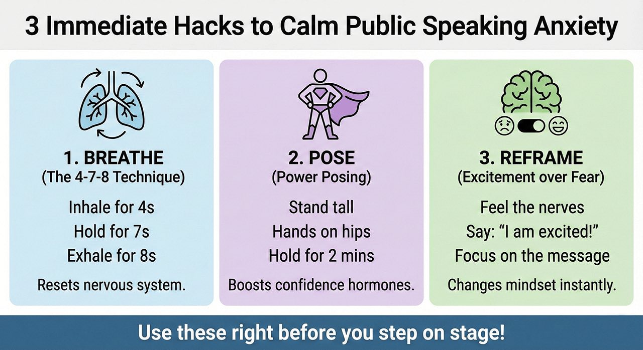 Medication: Doctors sometimes prescribe beta-blockers. These block the physical symptoms of anxiety (like shaking), allowing you to get through the speech calmly. Always consult a doctor before taking medication.