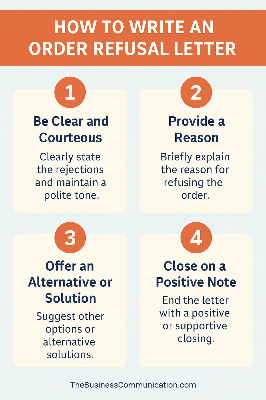 - Clearly state the refusal: “We regret to inform you that we are unable to accept this order.”