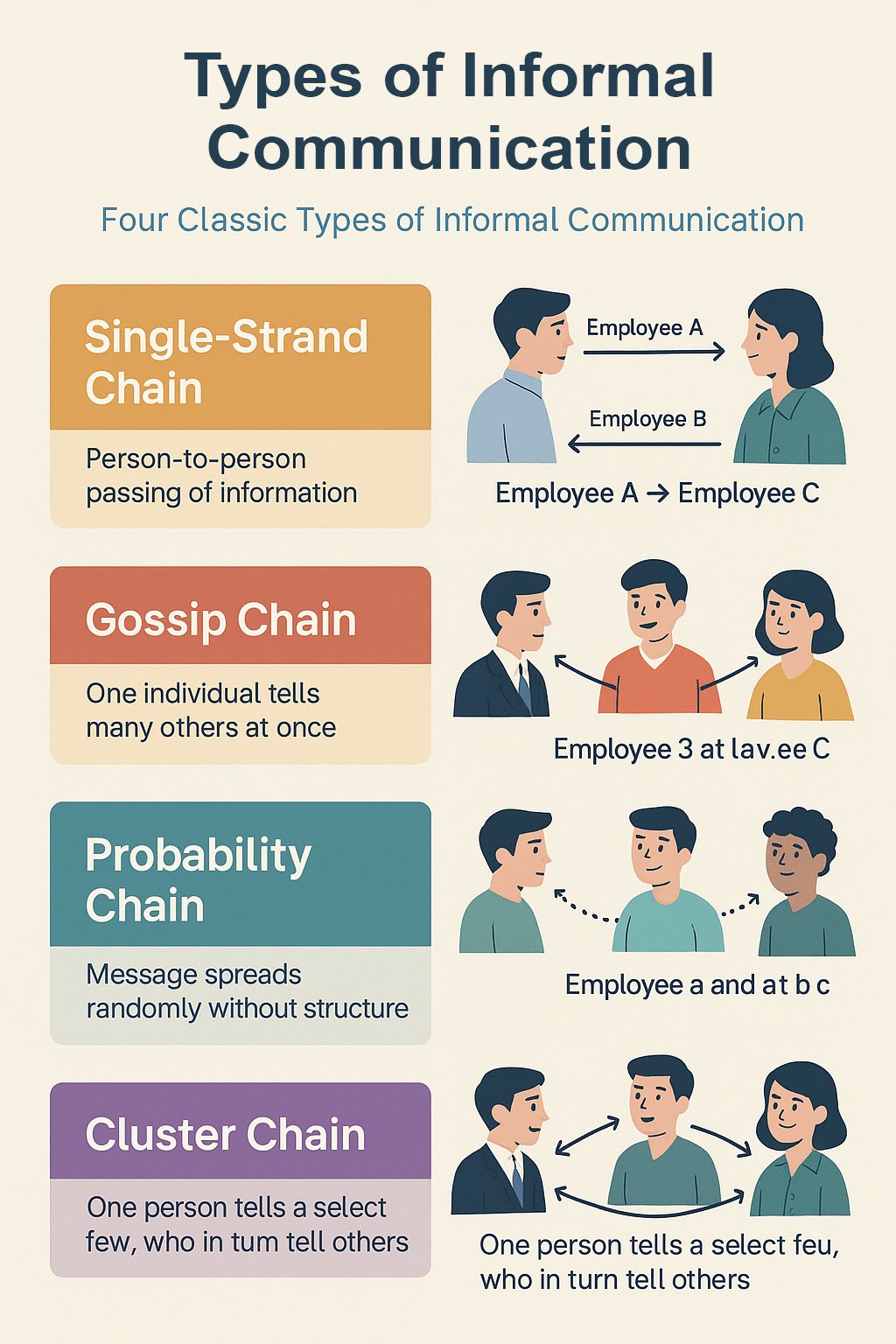 Informal communication may look casual, but it has its own clear structure. The four main types of informal communication are single-strand chain, gossip chain, probability chain, and cluster chain. Each works differently, with its own strengths and weaknesses.